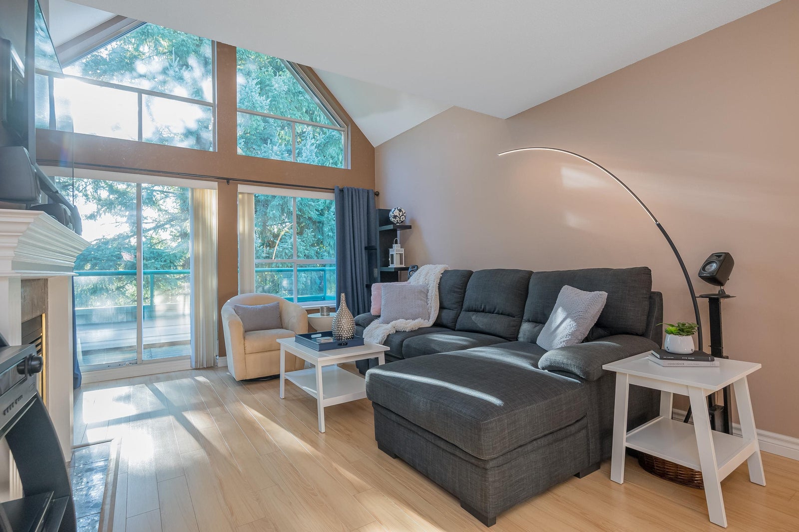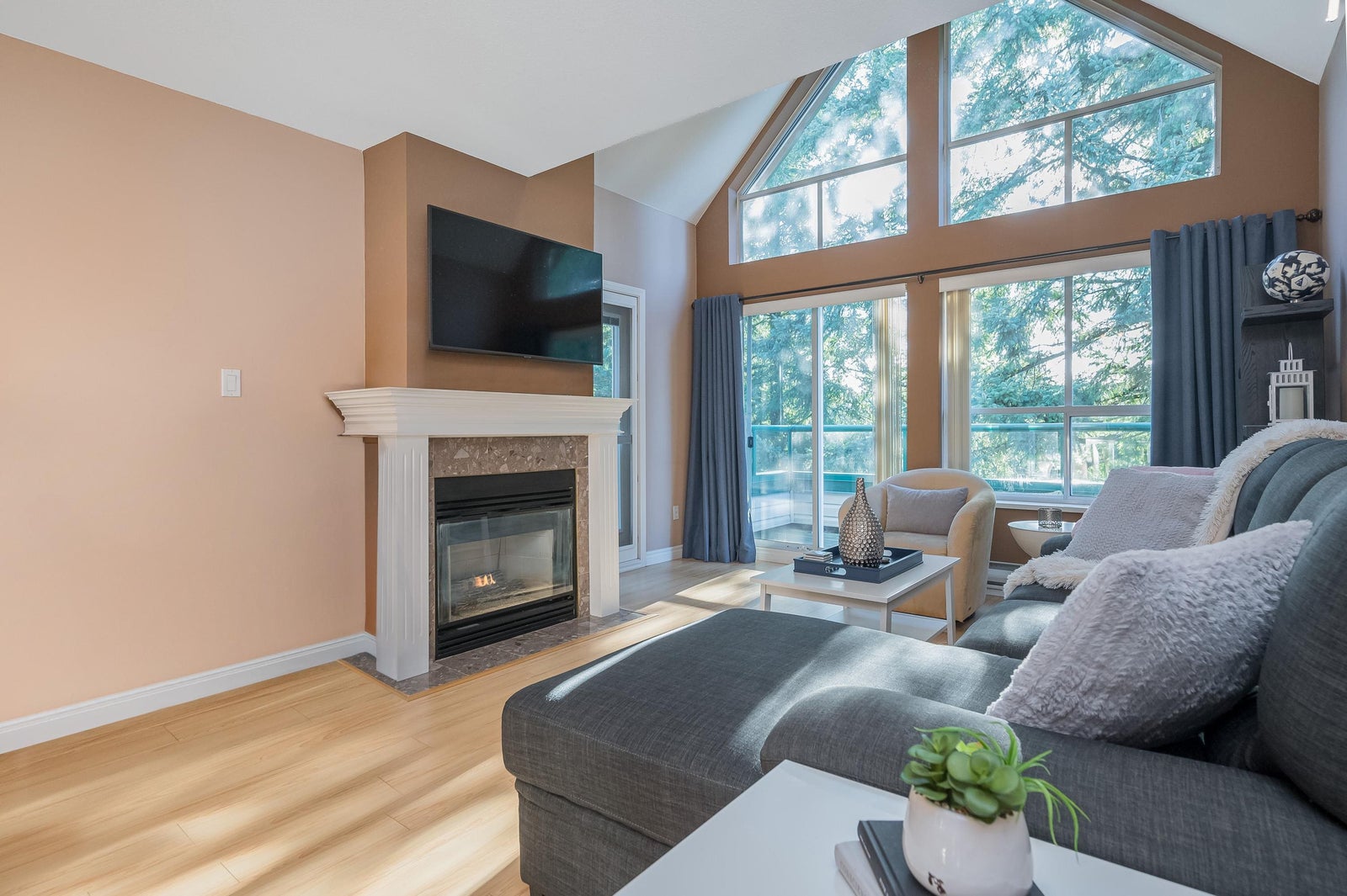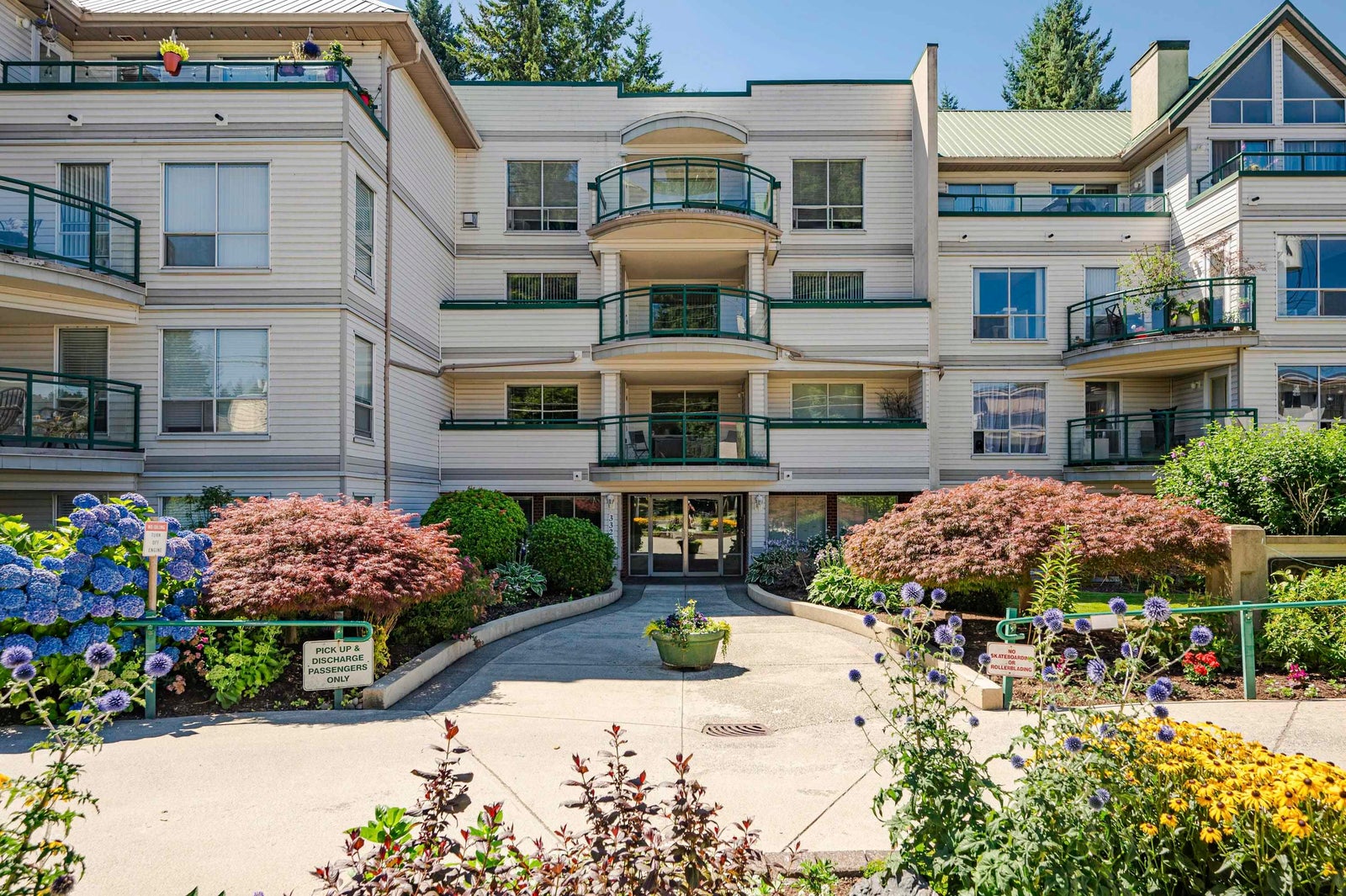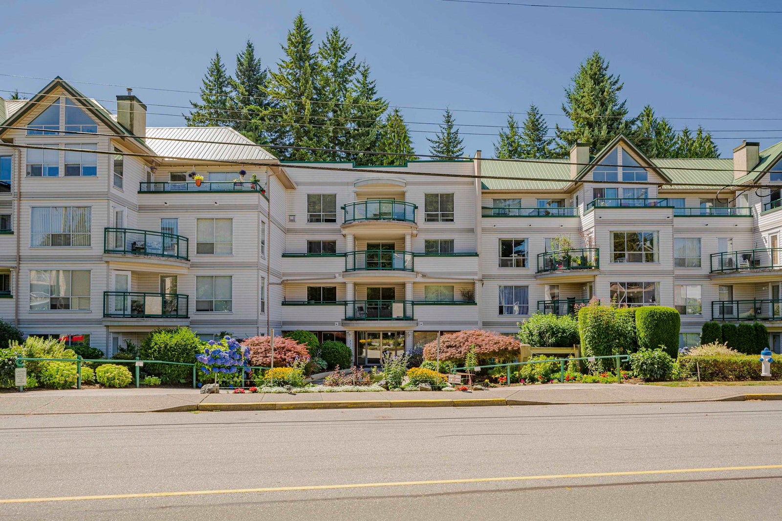 TOP FLOOR, VAULTED CEILING at Emerald Springs! Ideally located at the back of the complex with serene views of the garden and trees. This exceptional 2-BDRM, 2-BATH home is bathed in natural light and one of the best in the building, offering 967 sq ft of quiet and peaceful living. The contemporary kitchen offers excellent functionality & opens to the living room with gas F/P. Enjoy outdoor living with TWO private sundecks—perfect for soaking up daytime sun or stargazing at night. 1 Locker, 1 Parking (can rent add. parking from strata). Strata fees include gas & hot water. Amenities: rec room w kitchen, exercise room, workshop, & bike storage. Pet friendly. Located on the bus route, close to all levels of schools. Easy walking distance to nature at Mill Lake Park, shops, services & dining.